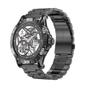 • Swiss Military Dom 2 comes with a 1,39″ HD display using the high-response touch-sensitive screen, side button and fully rotatable crown, offset for easy access. Rotate the crown for easy scrolling through on-display features and volume settings